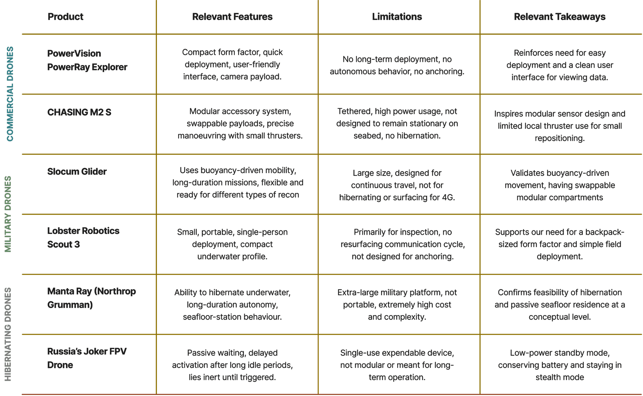 To understand where our concept fits within the existing landscape, a range of underwater drones already available in the market was studied.